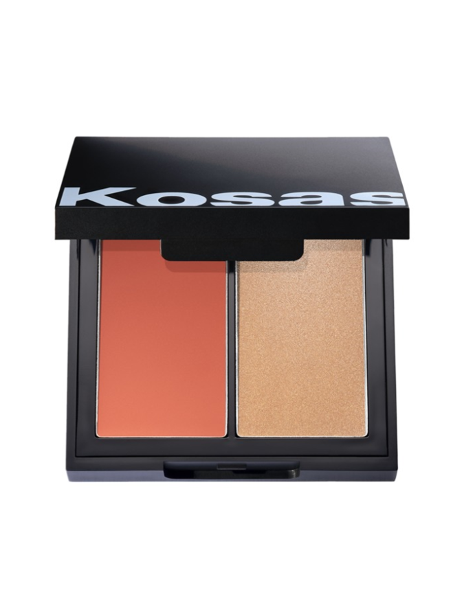 Instead she takes the blush from the unfortunately discontinued Kosas Color and Light Palette in 'Helios' and buffs it onto her temples, lids, cheeks and nose, but the blush and highlight in Isamaya's Skin Enhancing Duo in 'Nectarine' ($58 from MECCA) looks pretty similar in our opinion.