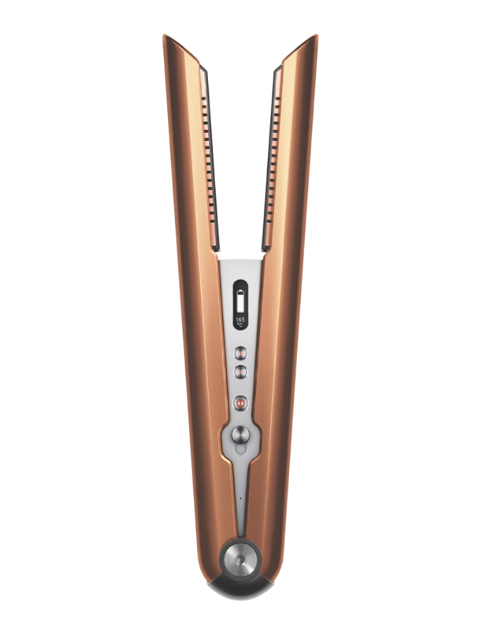 "Next, in larger sections, I spray Joico Heat Hero Glossing Thermal Protector ($28.99 from Oz Hair & Beauty) and flat iron the hair with the Dyson Corrale™ straightener ($699 from Dyson) at medium heat settings to smooth out any remaining flyaways and add extra shine. [Then], I create curl-like waves in 2-inch sections at the ends. Roll up and pin the ends and keep roots flat to the head to set," he continued.